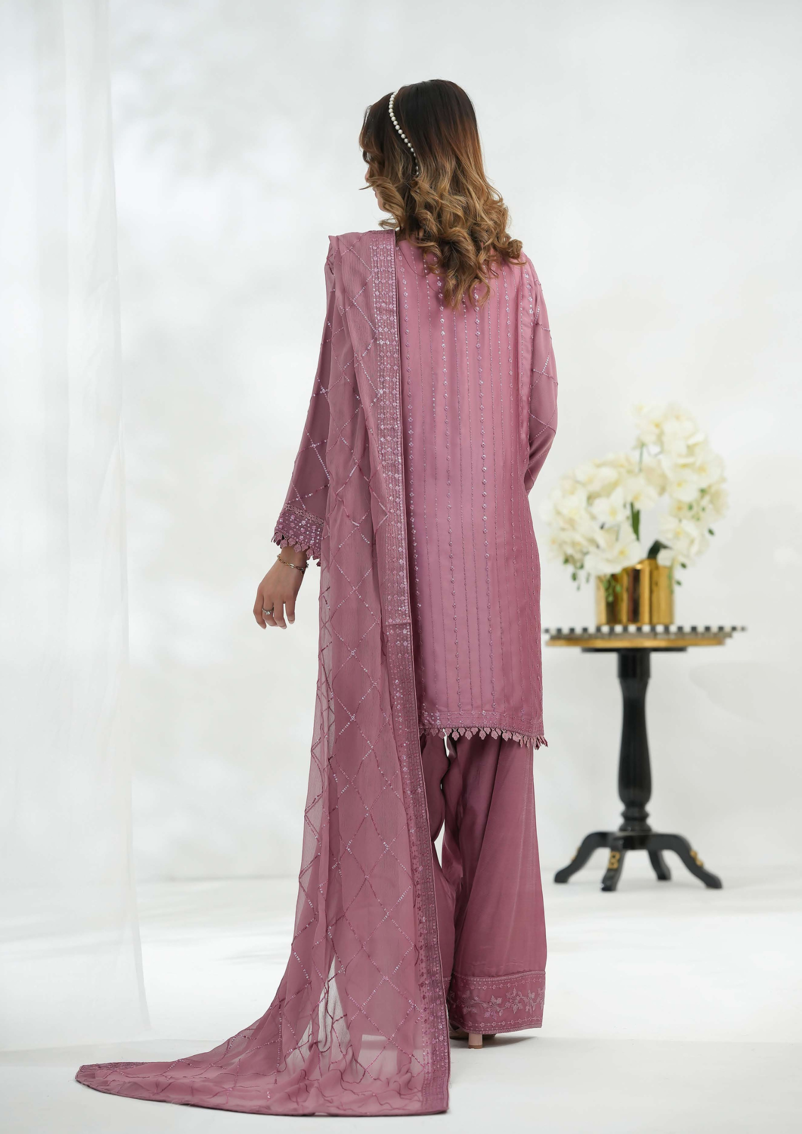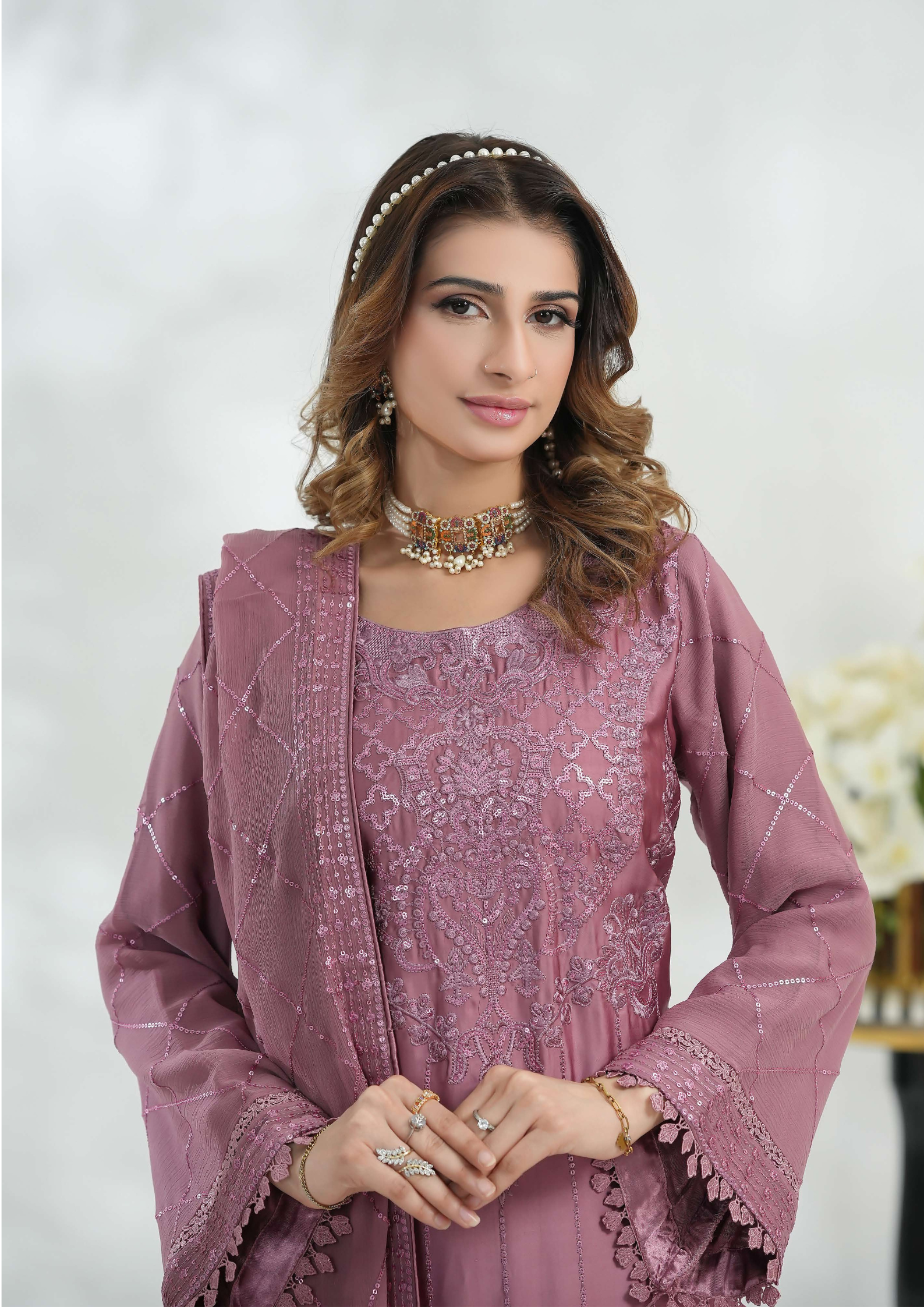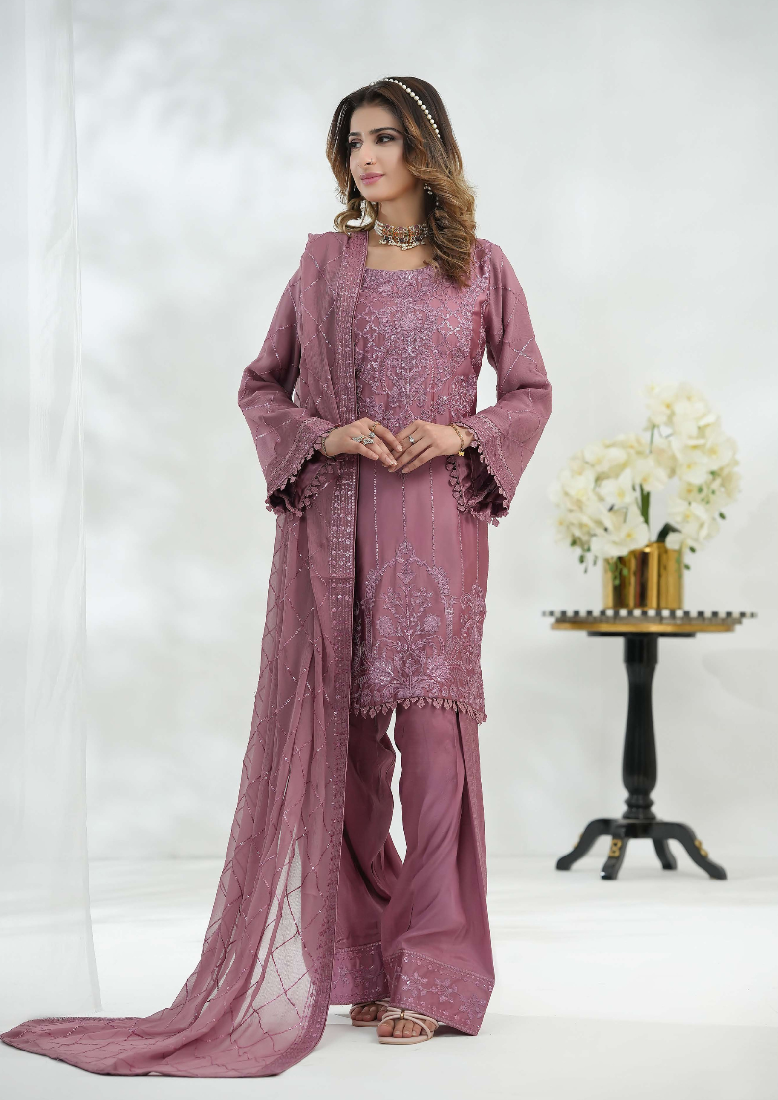 Shanse Silk Embroidered 3PCS Ready-to-Wear Farshi Shalwar | Tea Pink